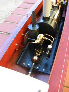 Als Antrieb dient eine Dampfmaschine (bei meinen Prototypen von der Firma Regner, aber im Prinzip kann der Rumpf an viele Maschinen angepasst werden), der über eine hochwertige Welle einen Messingpropeller antreibt. Je nach Typ der Maschine lassen sich verschiedene Funktionen fernsteuern. Ich lege Wert darauf, dass die Maschine mit geringem Aufwand aus dem Rumpf gehoben werden kann, so dass sie zur Wartung und Reinigung zugänglich ist.
