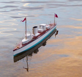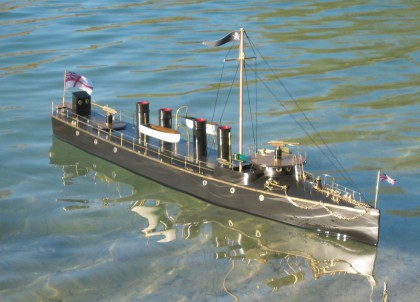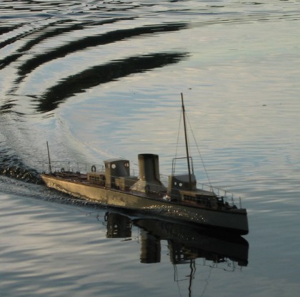 The hull is based on the plan I drew for my private Turbinia in 2006, displaying the lean lines typical for fast watercraft of the era. Despite their old-school appearance, these models can be sailed quite swiftly, to everyone’s surprise.