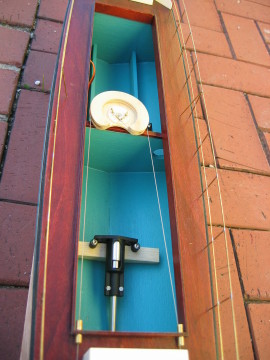 Hidden inside is an electric motor of more or less modern construction that acts upon a brass propeller via a high-quality prop-shaft. Shaft and motor are connected by a flange that aligns them perfectly to keep noisy vibrations at bay. The motor mounts are standard to allow for a wide variety of motor options. Twin engines and shafts are a further possibility. The torques of counter-rotating props cancel each other out and thus improve the handling, besides, they make for an awesome sight. (better picture with everything installed will follow)